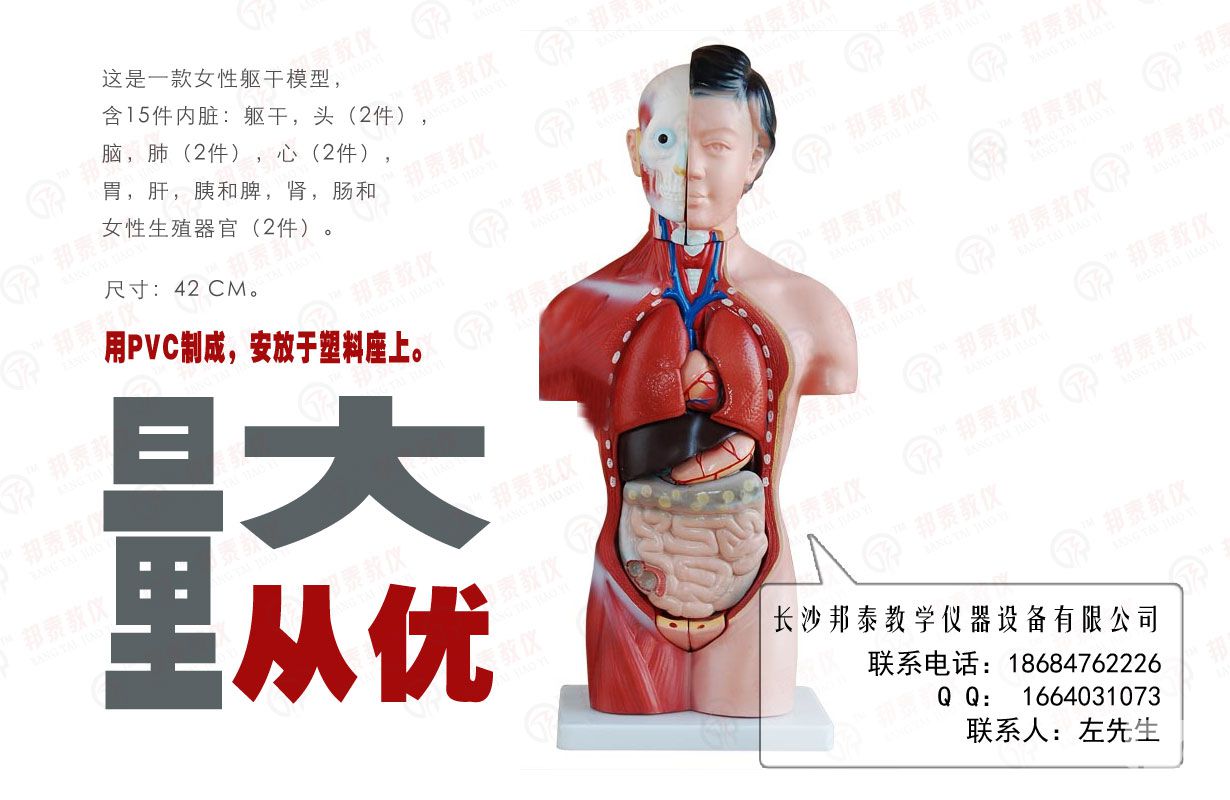 女性頭、頸、軀干模型含15件內(nèi)臟:軀干,頭2件,腦,肺2件,心2件,胃,肝,胰和脾,腎,腸和女性生殖器官2件。
