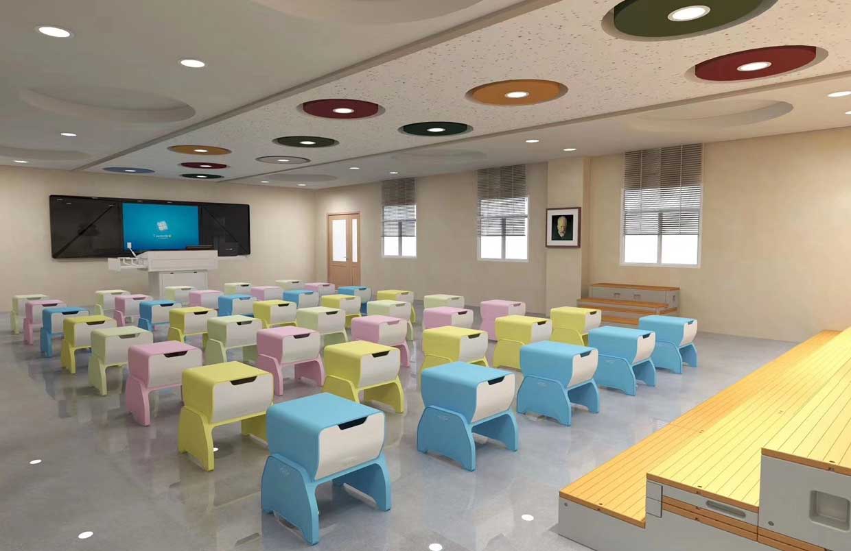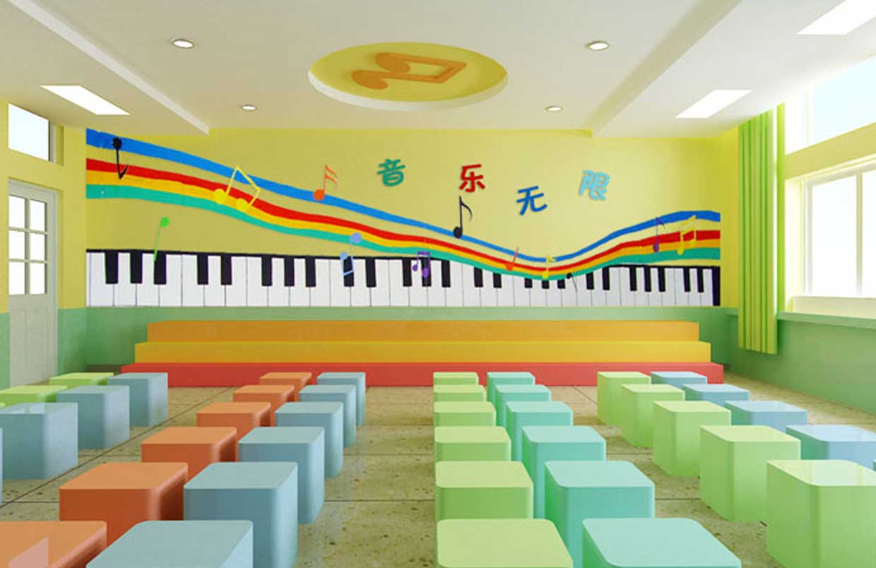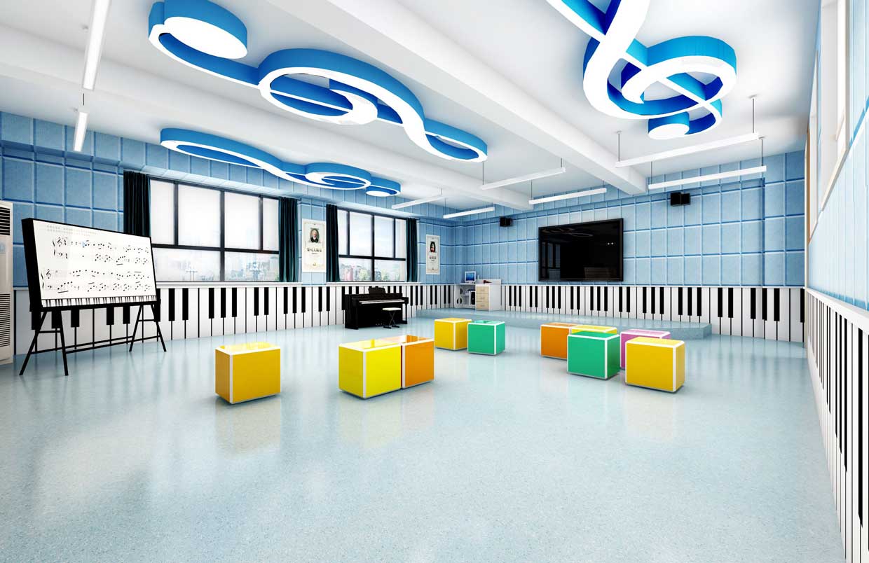 對于教師的教學需要配備有譜架、教師桌椅等,而學生應有六面體凳和普通帶小桌板的椅子等。教室四周墻壁可懸掛音樂家掛圖、樂器掛圖、識譜知識掛圖、音樂故事簡介等,可以幫助學生了解關于音樂的相關知識。此外還可以用各種各樣彩色的音符點綴教室,色彩偏亮色,活躍而灑脫??扇〗淌乙贿呉粔K區(qū)域可以設置儲物柜,用于儲藏各種樂器。