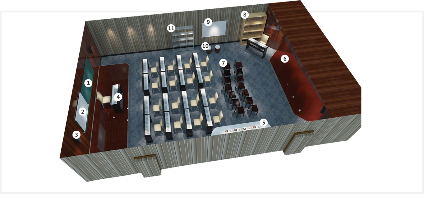 音樂教室應最基本應配備鋼琴、口風琴、口琴、打擊樂器、節(jié)拍器、豎笛、手風琴、Midi作曲系統(tǒng)、電貝斯、架子鼓、薩克斯、電吉他教學標準樂器,有助于老師引導學生聆聽與學習各種音樂,培養(yǎng)音樂興趣。此外,可以視情況而配備各種風格樂器,如管制樂器,中國傳統(tǒng)古樂器等。