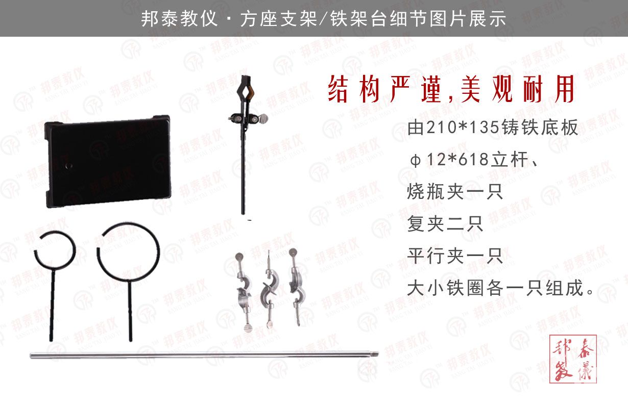 1、 方座支架,首先將底板方在平衡的桌上,將立柱裝在底板的前面孔上,根據(jù)實驗要求,調(diào)節(jié)鐵環(huán)、鐵夾于適當位置進行實驗。