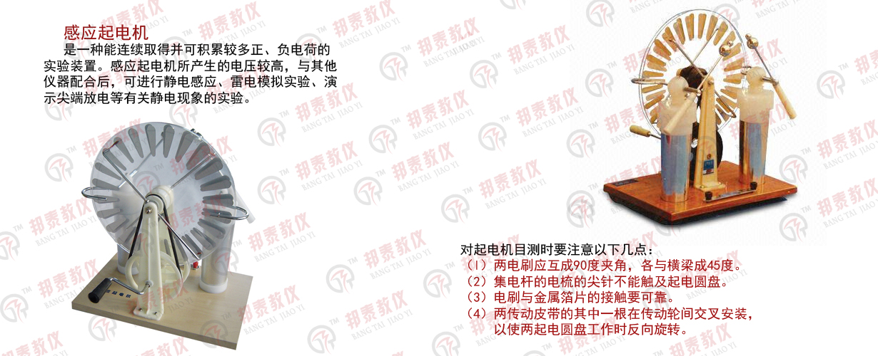 感應(yīng)起電機(jī)主要用于課堂演示靜電現(xiàn)象及空氣中的放電現(xiàn)象。一對(duì)直徑約30厘米的玻璃盤(pán)以100轉(zhuǎn)/分的速度旋轉(zhuǎn),大約可以產(chǎn)生2萬(wàn)伏的電壓,在空氣中產(chǎn)生5厘米長(zhǎng)的電弧,同時(shí)發(fā)出強(qiáng)烈的噼啪聲。由于其在實(shí)驗(yàn)過(guò)程中能產(chǎn)生較高電壓,所以學(xué)生需在教師的指導(dǎo)下使用,謹(jǐn)防觸電。